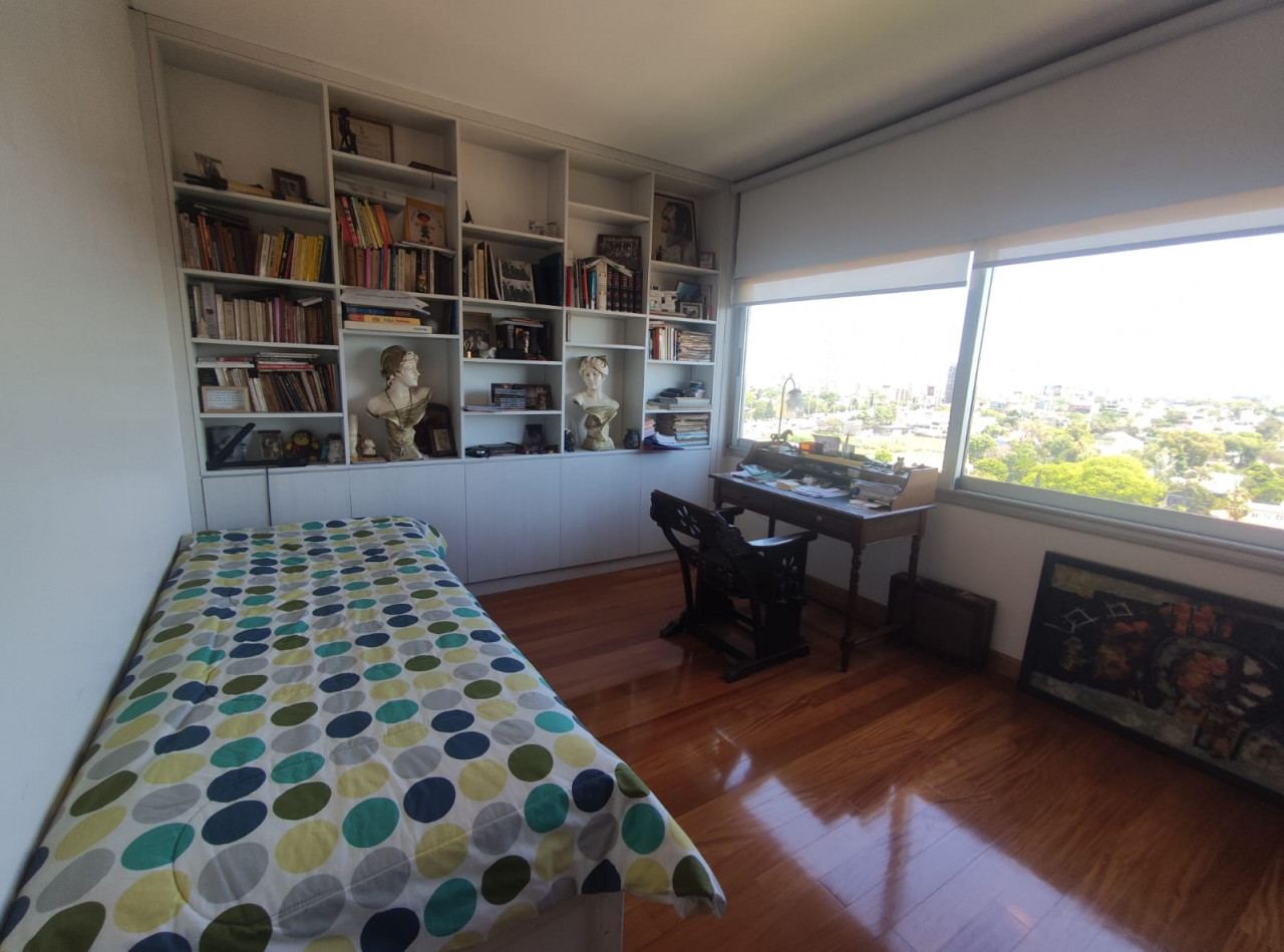 Segundo dormitorio con placard de dos hojas, biblioteca de piso a techo y de pared a pared, baño con bañera, calienta toallas y ventana ídem.