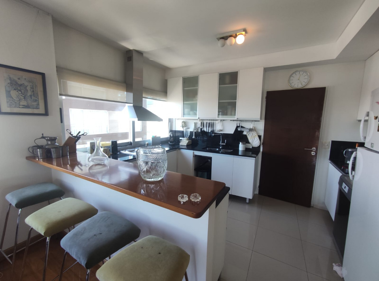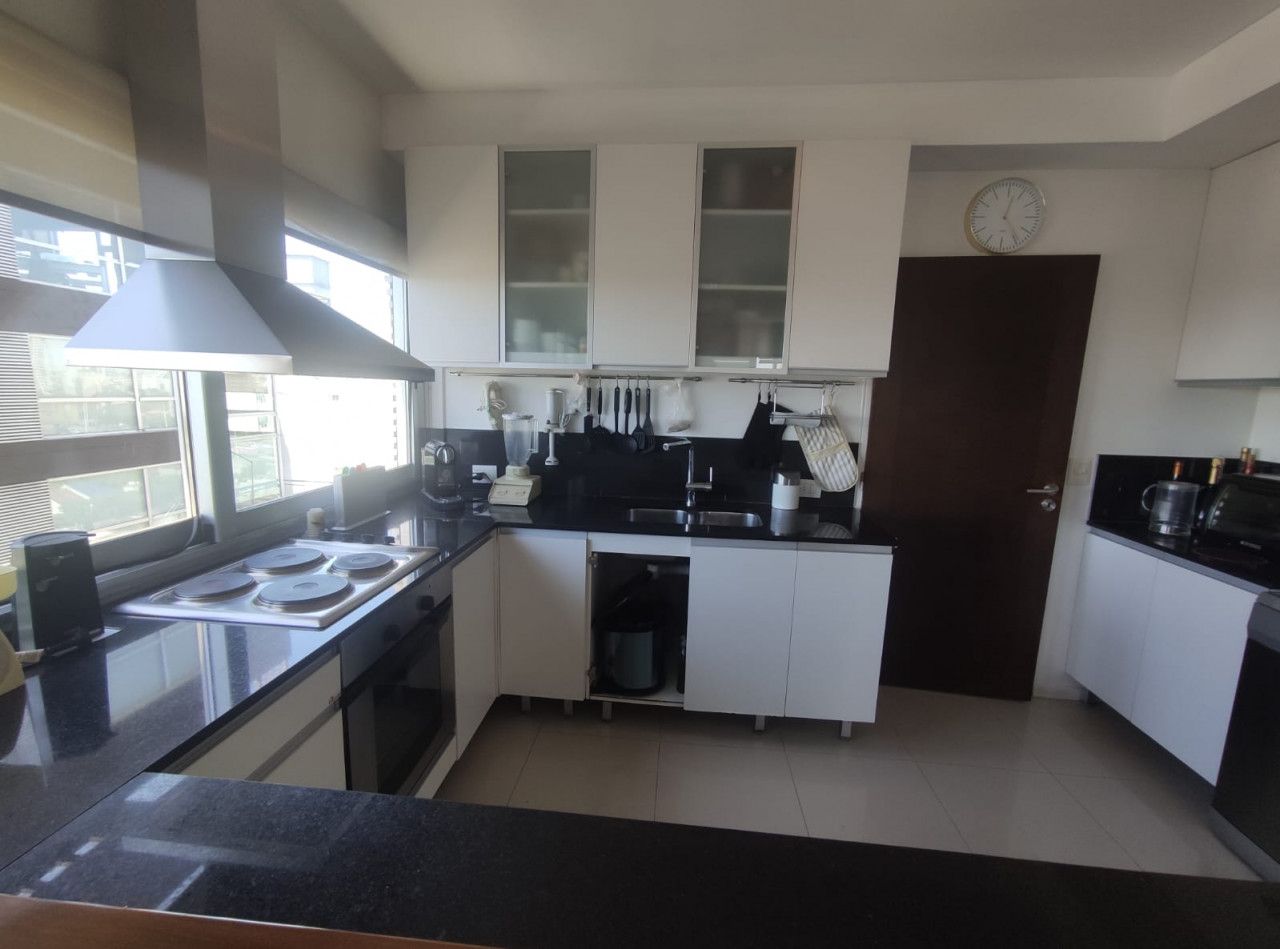 Sector cocina, con equipamiento de alta gama, se integra al living, a través de una barra desayunadora de roble, creando un espacio ideal para reuniones. Mesada de mármol negro en U, ventana de dos hojas, artefacto de cocina de 4 hornallas y horno, campana de acero con extractor, buena capacidad de guardado.